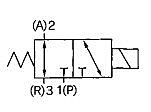 零位置:當電磁閥未作動時P口被封住,A口空氣排至R口